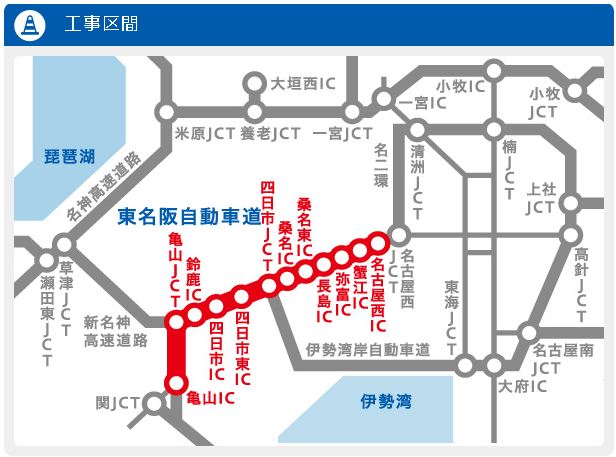 2014年6月2日(月)から6月13日(金)までの間、土日を除き東名阪自動車道 名古屋西IC ⇔ 亀山IC 上下線でリフレッシュ工事が行われています。